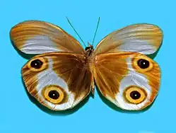 The upperside of the wings contains large white blotches, with broad brown edges and a wide eyespot surrounded with yellow orange located in the white area of the hindwings. The underside of the hindwings shows an outer angle completely brown and a wide patch with two large black eyespots surrounded with yellow orange. The abdomen is brown.[5][6][7]