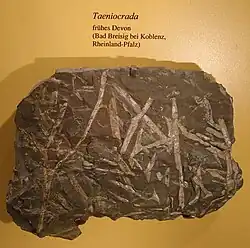 Taeniocrada decheniana, from the Lower Devonian,[2] had separate fertile stems which repeatedly branched in a dichotomous fashion ending in sporangia between 3 and 7 mm long. A few sporangia were borne on the sides of stems. The species was found in dense stands. It has been suggested that it was aquatic or semi-aquatic because it apparently did not have stomata on the flattened stems.[3]