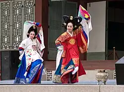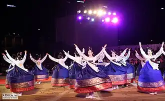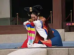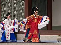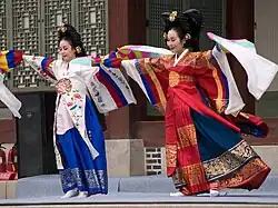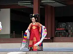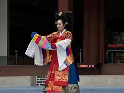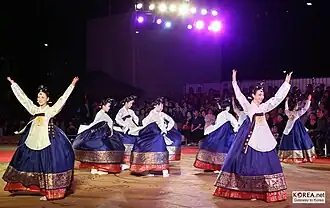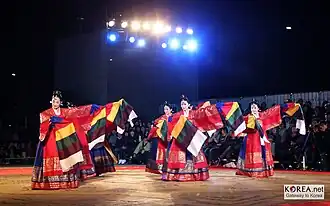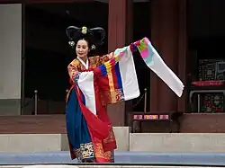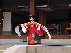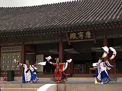 Taepyeongmu (Korean: 태평무; lit. great peace dance) is a Korean dance with the function of wishing a great peace for the country. Its exact origin is unknown, but certain style of the present was composed by Han Sŏngjun (1874–1941), an outstanding master of Korean dance in the beginning of last century. There are three assumptions regarding the origin of Taepyeongmu. One is a court dance occasionally performed by kings during the Joseon period. Therefore, the costumes used by the dancers are similar to the gwanbok (관복; lit. official clothing) formerly worn by Korea's kings and queens.[1]