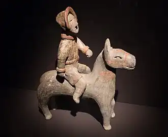This is the earliest known representation of a cavalryman in China.[1] Very few such figurines are known from this time, prior to the 210 BCE Terracotta Army.[3] The outfit is of Central Asian style, probably Saka,[4] and the rider with his large nose appears to be a foreigner.[1] King Zheng of Qin (246–221 BCE) is also known to have employed steppe cavalry men in his army, as seen in the Terracotta Army.[5]