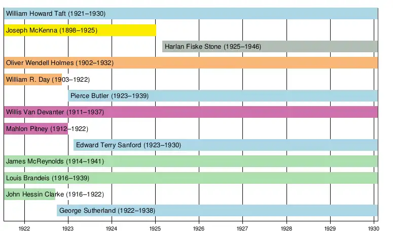 The Taft Court began in 1921 when President Warren Harding appointed former President William Howard Taft to replace Chief Justice Edward Douglass White, who Taft himself had made Chief Justice in 1910. The Taft Court began with Taft and eight members of the White Court: Joseph McKenna, Oliver Wendell Holmes Jr., William R. Day, Willis Van Devanter, Mahlon Pitney, James Clark McReynolds, Louis Brandeis, and John Hessin Clarke. In 1922 and 1923, Harding appointed George Sutherland, Pierce Butler, and Edward Terry Sanford to replace Day, Pitney, and Clarke. In 1925, President Calvin Coolidge appointed Harlan F. Stone to replace the retiring McKenna.
