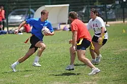 A tag game known as EagleTag, or non contact rugby league or flag rugby, is played in the United States using the same rules as Oz Tag.[24] Another tag game based on the laws of rugby union, known as American flag rugby, takes place in a league every Saturday morning in July in Morris County, New Jersey.[25][26]