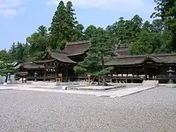 The foundation of Taga Taisha is unknown. It is mentioned in the ancient Kojiki and Nihon Shoki chronicles from 712 AD.[1] The shrine's legend connects it with the legendary hero Yamato Takeru, whose son, Inugami no Mitasuki was sent as an emissary to Sui China in 614 AD and the first Japanese embassy to Tang China in 630 AD. He was also the ancestor of the Inukami clan, from which Inukami District, Shiga (where the shrine is located) takes its name. However, in the 914 AD Engishiki records, it is listed only as a small shrine. From the Heian period it was revered as having efficiency for childbirth, vocational aid, fire extinguishing and longevity. During the Muromachi period, as pilgrimages to the Ise Grand Shrine and the Kumano Sanzan gained in popularity, pilgrims were encouraged to visit Taga Shrine as part of the route. In the Sengoku period, Toyotomi Hideyoshi had a strong faith in this shrine and frequently prayed for an extension of his mother's life. He donated 10,000 koku, or the equivalent revenue of one year for a daimyō for its reconstruction and upkeep.[1]