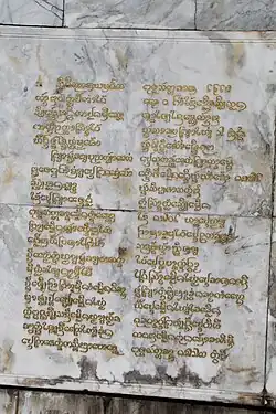The Tai Tham script shows a strong similarity to the Mon script used by the Mon kingdom of Haripunjaya around the 13th century CE, in the present-day Lamphun Province of Northern Thailand. The oldest known document containing the Tai Tham script is dated to 1376 CE and was found in Sukhothai. The document is a bilingual inscription on a gold folio, containing one line of Pali written in the Tai Tham script, while the vernacular is written in the Siamese language, using the Sukhothai script. The Tai Tham script was adapted to write vernacular languages not later than the 15th century CE, most probably in Chiang Mai, in the Lan Na Kingdom.[8] The script spread from Lan Na to surrounding areas such as modern day Laos, Isan, Shan State and Sipsong Panna. Numerous local variants developed, such as the Lue variant (Sipsong Panna), the Khuen variant (Shan State) and the Tham Lao variant (Laos and Isan). The variants differ only slightly in appearance, and the system of writing has remained the same.[9] As the name suggests, the use of the Tham (Dharma) script in Lao was restricted to religious literature, either used to transcribe Pali, or religious treatises written in Lao intended solely for the clergy. Religious instructional materials and prayer books dedicated to the laity were written in Tai Noi instead. As a result, only a few people outside the temples were literate in the script. In Isan, evidence of the script includes two stone inscriptions, such as the one housed at Wat Tham Suwannakhuha in Nong Bua Lamphu, dated to 1564, and another from Wat Mahaphon in Maha Sarakham from the same period.[10]