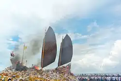 One of the grandest Ong Yah's festivals in Taiwan takes place in Donglong Temple which is located in the city of Donggang, Pingtung County, once every three years. The 2009 festival began on October 10 and culminated in the early morning of October 17, when a wooden boat would be processed in the area and sent off while set on fire on the beach indicating the Deities heading back to the Heaven.[3][4]