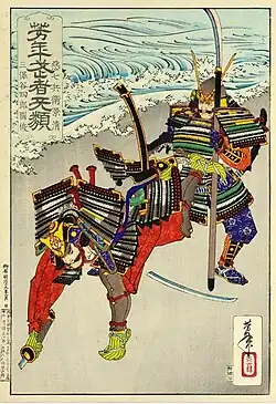 Kagekiyo is perhaps most famous for his appearance in the eleventh chapter of the fictionalized epic Heike Monogatari (The Tale of Heike) during the Battle of Yashima, in the section called "The Dropped Bow" (弓流). He grasps the neckguard of Minamoto warrior Mionoya no Jūrō in order to prevent his escape; Mionoya does escape Kagekiyo's grasp, hiding from battle behind a friendly mount. Then, Kagekiyo, leaning on his spear, exclaims "You must have heard of me long ago. See me now with your own eyes! I am the man known to the young city toughs as Akushichibyōe Kagekiyo of Kazusa!"[1] Kagekiyo then retires from battle.[2]