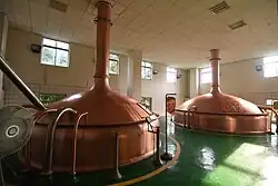 The oldest industrial plant that produces the brand, the Jianguo Brewery complex in Taipei, is now more than a century old. It has been designated by the Taipei City Government as an historic site, for its historical and architectural value. The complex is made up of two large buildings, a red-brick one and a green-tiled one, flanked by a number of smaller wooden-framed and other structures. Inside the buildings, modern automated items of equipment, including stainless steel mash tuns, are in operation. The walls of the Taipei brewery are decorated with black-and-white photographs depicting earlier methods of production. The original copper mash tuns are no longer used, but remain in place as drawcards for tourists.[7][8][13]