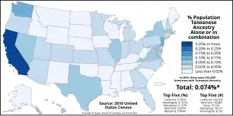 | 331,224 (2023)[a] (by ancestry or ethnic origin only) 392,012 (2023)[2] (born in Taiwan only) Range: 195,000[3] – 900,595[4] 0.06%–0.3% of the U.S. population (2017) | |
