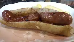 | Small sausage in large sausage | 大腸包小腸 | tōa-tn̂g pau sió-tn̂g | dàcháng bāo xiǎocháng | Local | A grilled Taiwanese pork sausage wrapped in a grilled, salty, sticky rice sausage. Usually wrapped with garlic and basil. Customer can also choose the flavor they want, such as black pepper, garlic, chili, butter and chocolate. A Taiwanese snack, common in night markets. |