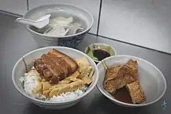 | Khong bah png (Braised pork rice) | 炕肉飯/爌肉飯 | khòng-bah-pn̄g | kàngròufàn | Fujian | Pork chunks, stewed in soy sauce and spices, then served on rice.[3] |
