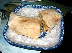 | Chiayi/Tainan | Coffin bread | 棺材板 | koaⁿ-chhâ-pang | Similar to French toast or bread bowl soups, but filled with savory fillings, such as black pepper beef or curried chicken. Thick-cut bread is dipped in egg, deep fried, cut along three sides, opened and filled, and eaten.[42] | |