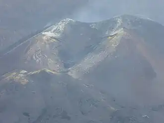 The volcano is 1,120 metres (3,670 ft) above sea level, with the cone of the volcano being approximately 200 metres (660 ft) high.[8][9] The main crater is 172 metres (564 ft) long and 106 metres (348 ft) wide, and is one of seven vents.[10] The Tajogaite eruption was associated with a magma-gas decoupled system, which resulted in 7-16% of the total erupted volume being made up of tephra.[11]