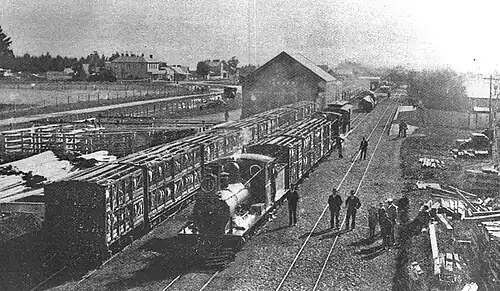 Edmund Allan and Samuel[21] Kingstreet[22] had a £14,100 contract to build the 14 mi (23 km) extension of the Napier to Waipukurau railway south to Takapau.[23] They built a 5th class station in 1875 and Donald McLeod, a Waipukurau carpenter,[24] built a goods shed and platform in 1877. Initially, only one train a day ran from Takapau.[25] In 1890 there were two trains a day.[26] There was a post office at the station from 1887 to 1911. By 1896 there were 30 ft (9.1 m) x 20 ft (6.1 m) and 40 ft (12 m) x 30 ft (9.1 m) goods sheds and also a cart approach, loading bank, cattle yards, stationmaster's house, urinals and a passing loop for 24 wagons, extended to 55 in 1911 and further extended in 1940. In 1905 a verandah was added and the platform extended. Electric lights were installed in 1921. Railway houses were built in 1928 and 1946.[18]