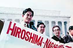In 1958, he was involved in founding the Association of A-Bomb Survivors in Kunitachi, Tokyo. From then on, he engaged in activities aiming to abolish nuclear weapons and establish a law for supporting A-bomb survivors based on national compensation.[3] In 1976, then a Secretary of Nihon Hidankyo, he "took part in the second people’s delegation to the U.N., along with several Hibakusha representatives from different parts of Japan. The delegation submitted “A Report to the U.N. Secretary General: the Damage and Aftereffects from the Atomic Bombs on Hiroshima and Nagasaki”, and requested the U.N. to hold an international symposium in Japan with the participation of experts, to explore the impact of the atomic bombing and the situation of surviving victims. This request was not met by the U.N., but in 1977, the “International Symposium on the Damage and After-effects of the Atomic Bombing of Hiroshima and Nagasaki” was held by the U.N. Special NGO Committee for Disarmament."[4]