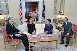 Takeshita was the minister of finance from 1979 to 1980, and he again accepted the finance position and was in office from 1982 to 1986. In this period, he achieved prominence as Japan's negotiator during deliberations which led to the agreement which is known as the Plaza Accord in New York.[8] In the period Takeshita was finance minister, the Yen appreciated relative to other international currencies. The rise of the strong Yen (endaka) enhanced Japan's status as a financial powerhouse[9] and led to the Japanese asset price bubble of the 1980s.[1]