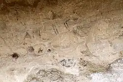 The Takiroa Rock Art Shelter is an archaeological site located along State Highway 83 near Duntroon, New Zealand.[2] The site features a limestone rock shelter containing several pieces of Māori rock art, dating between 1400 and 1900 AD.[3] The shelter is open to public viewing, with fences constructed to protect the artwork from damage.