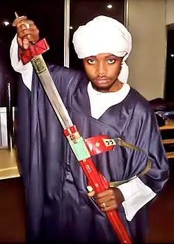 Takoba (also takuba or takouba) is a sword that is used across the western Sahel and among ethnic groups such as the Tuareg, the Hausa, and the Fulani. It usually measures about one meter in length. Takoba blades are straight and double edged with a pronounced tapering from the guard towards the tip; they can exhibit several notable features, including three or more hand-ground fuller grooves and a rounded point.[1]