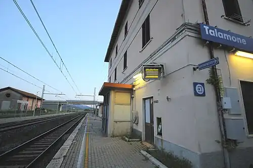 Talamone railway station is an Italian railway station on the Tirrenica railway line, located in the town of Fonteblanda, in the municipality of Orbetello, Province of Grosseto, Tuscany. The station also serves the nearby tourist destination of Talamone, from which it gets its name.