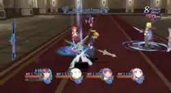 During battle sequences, the game uses the Style Shift Linear Motion Battle System.[11] Four characters are chosen to battle, with characters not controlled by the player being controlled by artificial intelligence with instructions set by the player beforehand.[2] Chain Capacity (CC) denotes the number of skills and actions a character can perform, with usage reducing it, and it recharges over time. During battle, the player and enemy have an Eleth Gauge, which, when filled, grants unlimited CC and resistance to stunning.[10] Each character has two skill systems: Assault Artes, which are predetermined combos, and Burst Artes, which can be mapped to specific inputs.[2] Skill and attribute development are dependent on Titles and their levels.[12] Titles are earned through story progression and completion of miscellaneous criteria during battle, and each have five levels that are advanced by completing battles.[12]