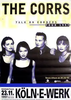 The Talk on Corners Tour is the second concert tour by Irish band the Corrs. Beginning in November 1997, the tour supported the band's second studio album, Talk on Corners. To date, it is their longest tour, with over 150 dates across Europe, Asia, Australia, New Zealand, and North America. The tour began with the band performing in theatres and nightclubs and, as the record’s success grew, progressed to arenas and amphitheatres, along with the group’s usual appearances at a variety of international music festivals.