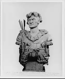 The statue is positioned on a base of Vermont marble and measures 96 by 59 by 46 inches (2.4 m × 1.5 m × 1.2 m). The area between the figurehead and Bancroft Hall is called T-Court.[5] In 1930, the wooden "heart" and "brains" of the original statue were transferred to the bronze statue.[1]