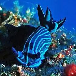 Tambja mullineri can reach a maximum length of about 20 millimetres (0.79 in). It shows light blue longitudinal stripes on a blue background. The five gill lamellae are dark blue, with light blue outer face of each gill.[4]