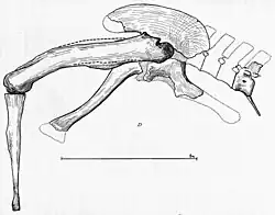 The pelvis was incomplete, containing both pubes and the left ischium. Uniquely, the ischium pointed almost directly horizontally. The pubes were likely nearly 1 metre (3.3 ft) when fully preserved, with thin shafts that were transversely expanded at the anterior ends where they connected, creating a V-shape in anterior view. The public shafts were strongly curved laterally, a condition observed in some related taxa, but from anterior view lacked intense curvature. As for the ischium, it was very incomplete, preserving primarily the proximal portion, but was firmly pointed downward. Both femora, in addition to the left fibula, were recovered, the former element being one of the largest recorded from a theropod at 1.26 metres (4.1 ft) in length. Its femora lacked strong curvature, though it was damaged during its transport to Germany. The lesser trochanter (a projection from the shaft of the femur) well developed with a strong separation from the larger greater trochanter. Additionally, the fourth trochanter is similarly well-developed and clearly visible in illustrations and photographs of the specimen. These traits are typical of basal carcharodontosaurids but contrast with the weakly developed lesser and fourth trochanters of Giganotosaurus and Mapusaurus. However, the accessory trochanter is "spike-like", a trait distinguishing Tameryraptor from other carcharodontosaurids. Its fibula was only 88 centimetres (35 in) long, around 1/3rd the length of the femora. The anterior end was triangular in lateral view with bulging condyles, whereas the posterior end was rounded, a trait distinguishing Tameryraptor from other carcharodontosaurids.[1][4]