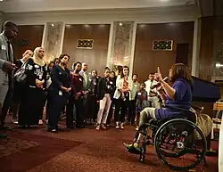 During the 115th Congress, Duckworth was credited with saving the Americans with Disabilities Act.[88] Specifically, she led public opposition to a controversial bill, H.R. 620,[89] and led 42 senators in pledging to oppose any effort to pass H.R. 620 through the Senate.[90] The Veterans Service Organization and Paralyzed Veterans of America recognized Duckworth's leadership in defending the Americans with Disabilities Act.[91]