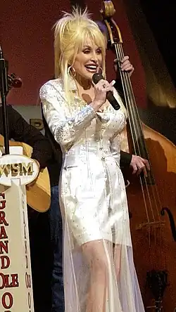 In 1993, Wynette joined with Loretta Lynn and Dolly Parton to record the studio album Honky Tonk Angels.[89] Parton herself explained that she wanted to make the project "before one of us goes". Consisting of classic country recordings performed in three-part harmonies, the album reunited Wynette with Steve Buckingham. Several selections on the project were penned by the trio, including one composed by Wynette herself.[90] Honky Tonk Angels reached number six on the Billboard country albums chart and number 42 on the Billboard 200.[34][91] It was Wynette's first top ten US album in 18 years and her first album in 22 years to certify gold in the United States.[34][50] AllMusic's Kelly McCartney called it "a fun listen"[92] while the Songwriters Hall of Fame described it as a "landmark album".[93]