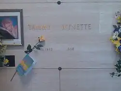 Wynette was plagued by health problems throughout her life. Her health declined even more in the final years of her life and she began to look frailer.[122] Nashville writer Alanna Nash recalled watching one of Wynette's final music videos and remembered her physical condition: "Tammy looked ancient, like a plant that had withered up about to die. I thought, 'this woman is dying – why isn't somebody doing something?'"[101] Wynette died on April 6, 1998, while sleeping at her Nashville, Tennessee, home. She was 55 years old.[123] Husband George Richey and Wynette were sleeping all day on adjacent living room couches when he discovered that evening that she was dead.[124] Her death was certified by her doctor, Wallis Marsh, who flew from Pennsylvania to make it official. He stated in his original report that Wynette died from a blood clot in her lung.[125]