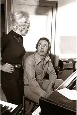 Jones and Wynette had been wanting to record together since they married. Although they started touring together in 1969, they could not record together until 1971, when Jones was released from his previous contract.[55] Their first single was a remake of Jones's solo release, "Take Me".[56] In 1971, it climbed to number nine on the US country chart and number 12 on the Canadian country chart.[32][37] Their first studio LP, We Go Together (1971), reached the top five of the Billboard country albums chart.[34] Their 1972 single, "The Ceremony", was also a top ten single in the US and Canada.[32][37] Altogether, Epic label issued seven studio albums of Jones and Wynette duets.[57] The pair were considered among country music's most successful and well-known duet partnerships.[58][59] Touring as a packaged duo, they were often referred to as the "President and First Lady". Their tour bus was labeled "Mr. and Mrs. Country Music".[58][40][60]