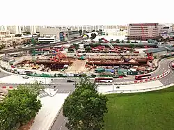 The station was constructed using the top-down method. This was to minimise movement to the existing viaducts for the EWL. As there is limited space, special low headroom machines were utilised to facilitate some of the works.[27] To prevent disruption to the operations of the bus interchange and the shops, a paid link was not constructed between the DTL and EWL stations.[28]