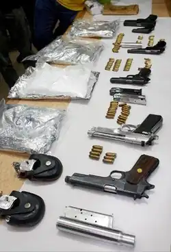 The police searched the rooms and found a total of six guns, 203 bullets, two pairs of handcuffs, and 4 kg of ketamine, with a street value of nearly $22,000.[10] Tan tried to bargain with the Malaysian police to give them information about where he purchased the gun and the people who helped him to do so in exchange for not getting handed over to the Singaporean police, which was unsuccessful.[18] One of the five other people arrested happened to be Ngoi Yew Fatt, a Singaporean gangster and murder suspect who was wanted by Singapore for another murder that took place in Yishun the year before Tan's crime. Another of the five arrested was also wanted for an unsolved murder in Malaysia.[14]