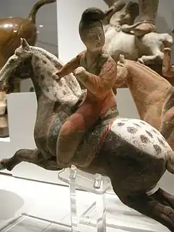 There may be groups of women as dancers or small seated orchestras of musicians, and some sitting figures appear to be beautifying themselves. More rarely, there are female riders and polo players, wearing male dress, which was usual for Tang women when riding, and apparently a fashion in the capital on other occasions.[46] The period was one of unusual freedom for wealthy women in China, and the figures reflect this.[47]