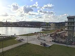 Tangen Park is a grass park in the tip of Tangen, there is a pedestrian road around the area and a playground in the middle, the area is also located with public bathrooms and bench down to the shore for fishing etc.