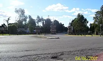 In 1931 Tanilba House was owned by Henry Halloran who designed such structures as "The Temple",[14] which is behind Tanilba House and which is visible on the main road leading to the house, the stone circular driveway, a wishing chair and other decorative stone structures on the property plus the elaborate gates at what were then the north and south entrances to the town. The stone for these structures was quarried locally from Mallabula. The northern gates are known as the water gates as they were designed to welcome visitors approaching from the water. Due to expansion the gates now stand inside the what were originally the suburb limits.