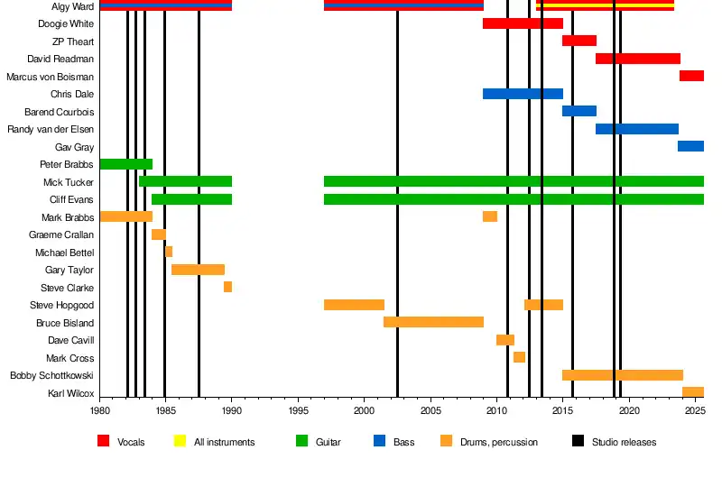 | Past members | Algy Ward Peter Brabbs Mark Brabbs Graeme Crallan Michael Bettel Gary Taylor Steve Clarke Steve Hopgood Bruce Bisland Dave "Grav" Cavill Mark Cross Doogie White Chris Dale Barend Courbois ZP Theart Randy van der Elsen Bobby Schottkowski David Readman |