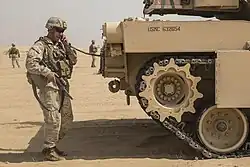Unlike previous US tanks, including the M60, the M1 Abrams tanks originally lacked a tank-phone. This meant that communication with local infantry necessitated allocation a radio frequency for communication with them.[20] The infantry phone was thought to lead to infantrymen speaking on it becoming exposed and a target for enemy forces.[21] This caused problems due to the loud noise of the AGT1500 gas turbine engine of the Abrams making it hard for infantry to make themselves heard whilst talking to tank crews, and exposing the tank crew to enemy fire.[22] This deficiency was fixed in 2006 with the TUSK (Tank Urban Survivability Kit) upgrade to the M1 Abrams that was implemented during the Iraq war, which included a tank phone mounted on the rear of the tank above the right track.[23]