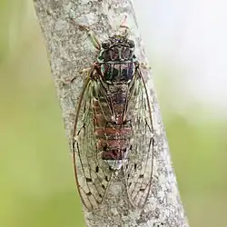 The males call with a distinctive, melancholy sound. This occurs before sunrise, and they often sing at twilight or after sunset, in dusk, when the temperature has dropped, or when it becomes cloudy.[1] The call changes with temperature, being correlated with the firing rate of the tymbal nerve.[2]