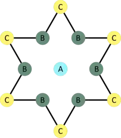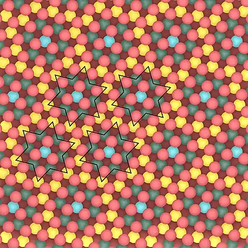 In the 1T phase, selenium atoms show an octahedral symmetry[5] and the relative orientation of the selenium atoms in the topmost and bottommost layers is opposed. On a macroscopic scale, the sample shows a gold colour.[4] The lattice parameters are a = b = 3.48 Å,[5] while c = 0.627 nm.[4] Depending on the temperature, it shows different types of charge density waves (CDW): an incommensurate CDW (ICDW) between 473 and 600 K (200–327 °C)[4] and a commensurate CDW (CCDW) below 473 K (200 °C).[4] In the commensurate CDW, the resulting superlattice shows a √13 × √13 reconstruction[6] often referred to as star of David (SOD),[6] with respect to the lattice parameter (a = b) of non distorted TaSe2 (above 600 K (327 °C)). Film thickness can influence as well the CDW transition temperature: the thinner the film, the lower the transition temperature from ICDW to CCDW.[4]