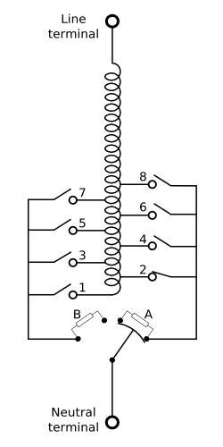 - Rotary switch continues to turn, breaking contact with diverter A. Load now supplied via diverter B alone, winding turns no longer bridged.
