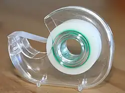 A tape dispenser is an object that holds a roll of tape and has a mechanism at one end to shear the tape. Dispensers vary widely based on the tape they dispense. Abundant and most common, clear tape dispensers (like those used in an office or at home) are commonly made of plastic, and may be disposable. Other dispensers are stationary and may have sophisticated features to control tape usage and improve ergonomics.