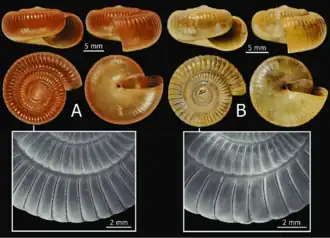 Nearer the coast, species typically have strongly evident radial grooves while those located further away from the coasts (T. zemia and T. alba) experience a loss in radial grooves on their shells.[1] This is with the exception of T. corona with obvious radial grooves but are found further away from the coast.[1]