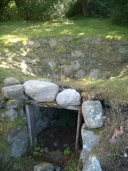 Tar kilns (Swedish: tjärmila, Danish: tjæremile, Norwegian: tjæremile, Finnish: tervahauta) are dry distillation ovens, historically used in Scandinavia for producing tar from wood. They were built close to the forest, from limestone or from more primitive holes in the ground. The bottom is sloped into an outlet hole to allow the tar to pour out. The wood is split into dimensions of a finger, stacked densely, and finally covered tight with earth and moss. If oxygen can enter, the wood might catch fire, and the production would be ruined. On top of this, a fire is stacked and lit. After a few hours, the tar starts to pour out and continues to do so for a few days.