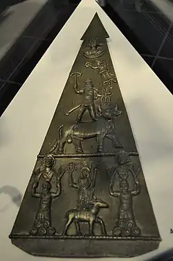The second type depicts him similarly, but standing atop a bull. This image was used for the weather god of Aleppo, which exercised a strong influence over perceptions of Tarhunz in Syria. This depiction disappeared in the 7th century BC, but reappeared in Northern Syria at the beginning of the Roman Imperial period and was brought to central Europe as Jupiter Dolichenus, whose cult centre lay in Doliche, northwest of Carchemish. The bronze triangle of Heddernheim, in particular, shows obvious similarities to the Luwian depiction of Tarhunz in Northern Syria.[24]