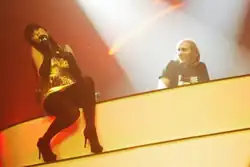 McDonald performed "Give Me More" alongside Justin Bieber, Jennifer, 1789 and Merwan Wim at the NRJ Music Tour de Paris.[24][25][26] She performed a show at the Grand Palais in celebration of 20 years of FG radio in Paris.[27][28][29] McDonald performed "Give Me More" live at the 18th Salon du Chocolat at the Parc des Expositions Porte de Versailles on 30 October 2012, wearing a dress made entirely of chocolate and arrived on stage in a chocolate space ship.[30][31] [32]