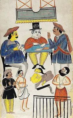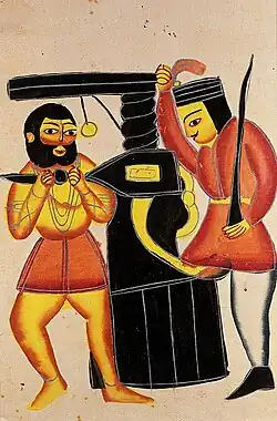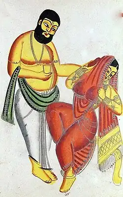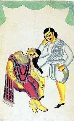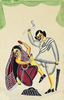 Numerous Kalighat paintings and Battala woodwork prints—created in the decade after the scandal—depicted the "immoral" affair, the gruesome murder and the resultant trial.[2][6] According to Chattopadhyay (author of Representing Calcutta: modernity, nationalism, and the colonial uncanny), it was the popularity of the plays combined with "the rhetoric of sin and morality" that inspired Kalighat painters to present this "tragedy as a spectacle".[2] Kalighat painters often chose to paint mythological themes and Bengali day-to-day life; the paintings on the Tarakeswar affair were a unique exception.[7]