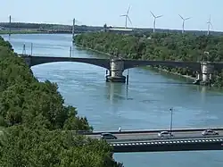 Tarascon is located 23 km (14 mi) south of Avignon and 20 km (12 mi) north of Arles, on the left (east) bank of the river Rhône. On the other side is the similarly sized town of Beaucaire in the département of Gard, région of Occitania. Directly opposite each other and connected by several bridges, Beaucaire and Tarascon effectively constitute one town, with about 30,000 inhabitants. An irrigation canal of 18,00 km length rejoins the Rhone near Tarascon.