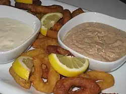 In Turkish cuisine, tarator is a sauce made from walnuts, bread, lemon juice or vinegar, ground garlic, and olive oil.[5] It is often served with fried calamari, for that reason it also called kalamari sos.[6][7][8] The sauce is also served with boiled vegetables.[9] There are also recipes of tarator sauce in Turkey that include yoghurt, or mayo.[6][8]
