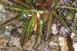 The leaves of Taraxacum ceratophorum are primarily basal, with a patent or erect orientation. They are alternate in arrangement and die annually. Petioles may or may not be present, ranging from 0 to 40 (or occasionally up to 70) mm in length. These petioles can be winged, either broadly or narrowly, and are typically glabrous. The leaf blades of this species are simple in structure, with attenuate bases. They measure 50 to 120 mm in length and 7 to 30 mm in width, displaying an oblanceolate shape. The blades are flat and appear to have a single vein or pinnate veins. The adaxial surface of the blade is glabrous, as is the abaxial surface. The blades can be broadly or narrowly lobed, with runcinate and dentate margins. The degree of incision can range from 5% to 95%, and the apices of the lobes are acute. The blade margins may exhibit between 1 and 8 (or occasionally up to 11) teeth on each side, counting both the dentations and tips of the runcinate lobes. These teeth are located toward the apex of the blade.[3]
